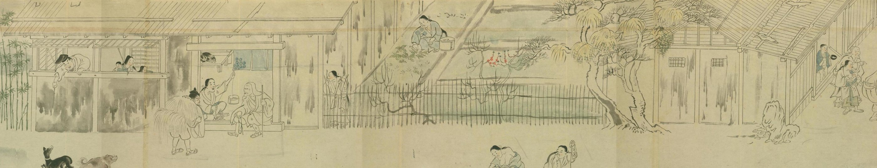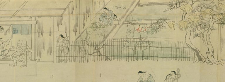 Local Machiya in Heian Period, artist unknown. Civilians at this period were still wearing 2-piece clothing, not "kimono" as we know it today.