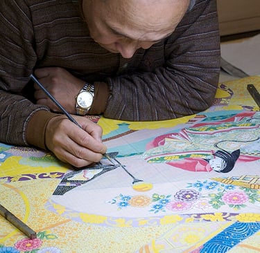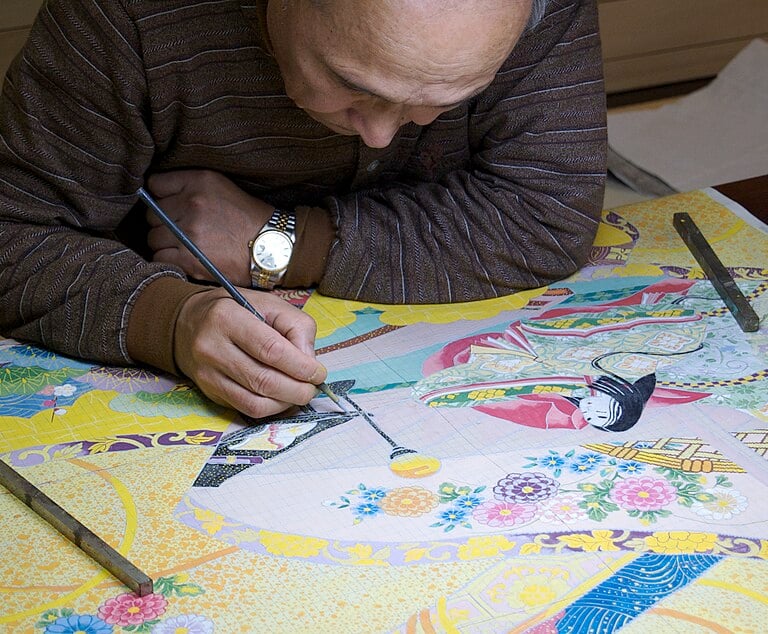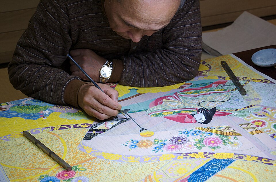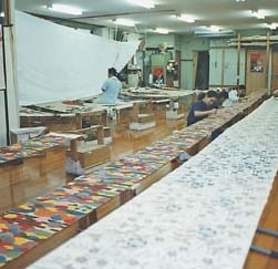 White woven fabric then gets dyed either by hand painting, stenciling, or tie-dyeing. Some designs will then be embroidered on some parts. Some special occasion kimonos are made ready to hang in shops, but for most kimonos for daily wear, the fabric roll "tan mono" are sold in shops.