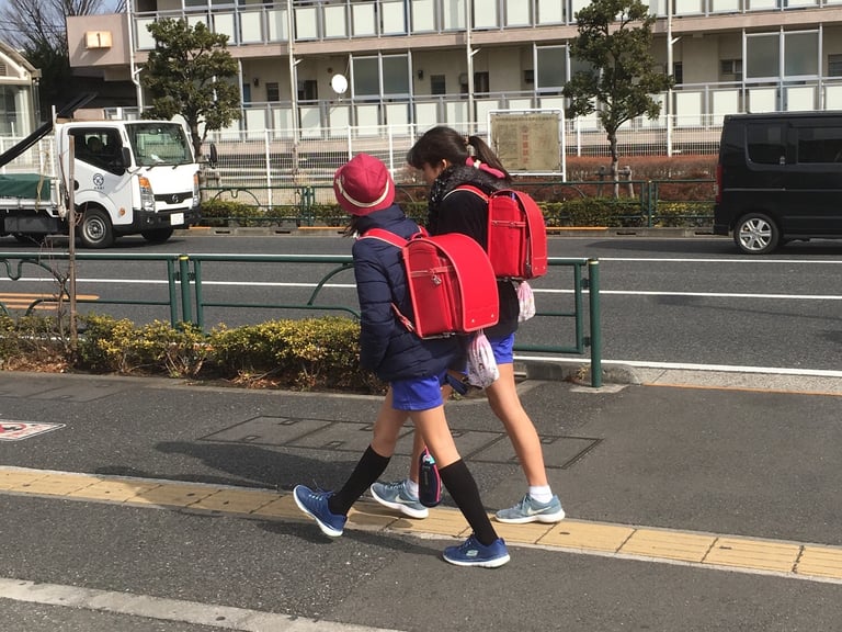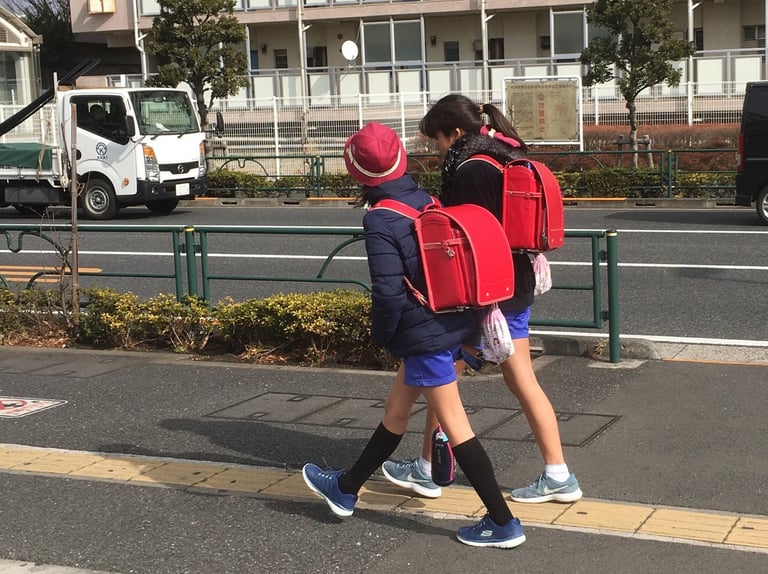 Kinchakus hanging from school bags.
